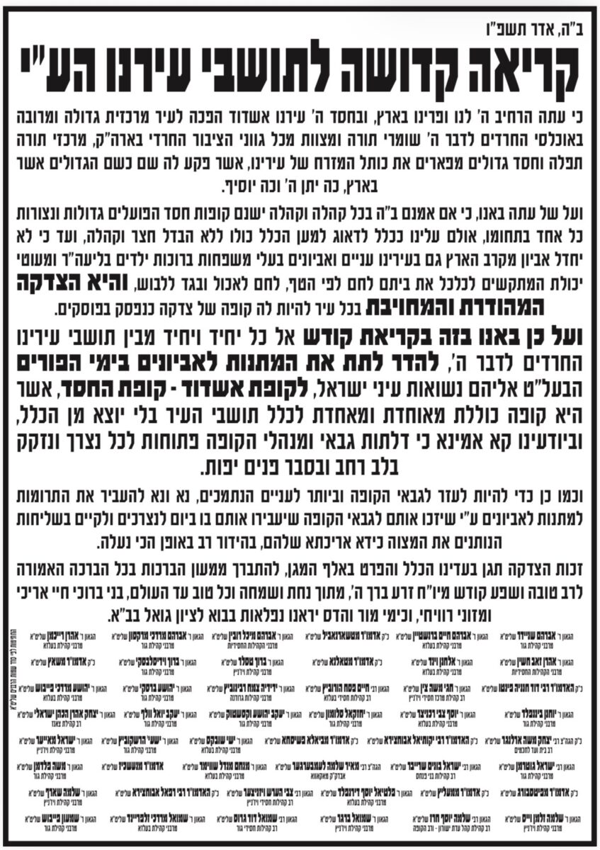 תושבי אשדוד לא זוכרים מכתב שכזה, כ-50 רבנים מהעיר אשדוד, ביניהם מגדולי האדמו״רים והרבנים חותמים יחדיו, בקריאת קודש ובפנייה לתושבי אשדוד.