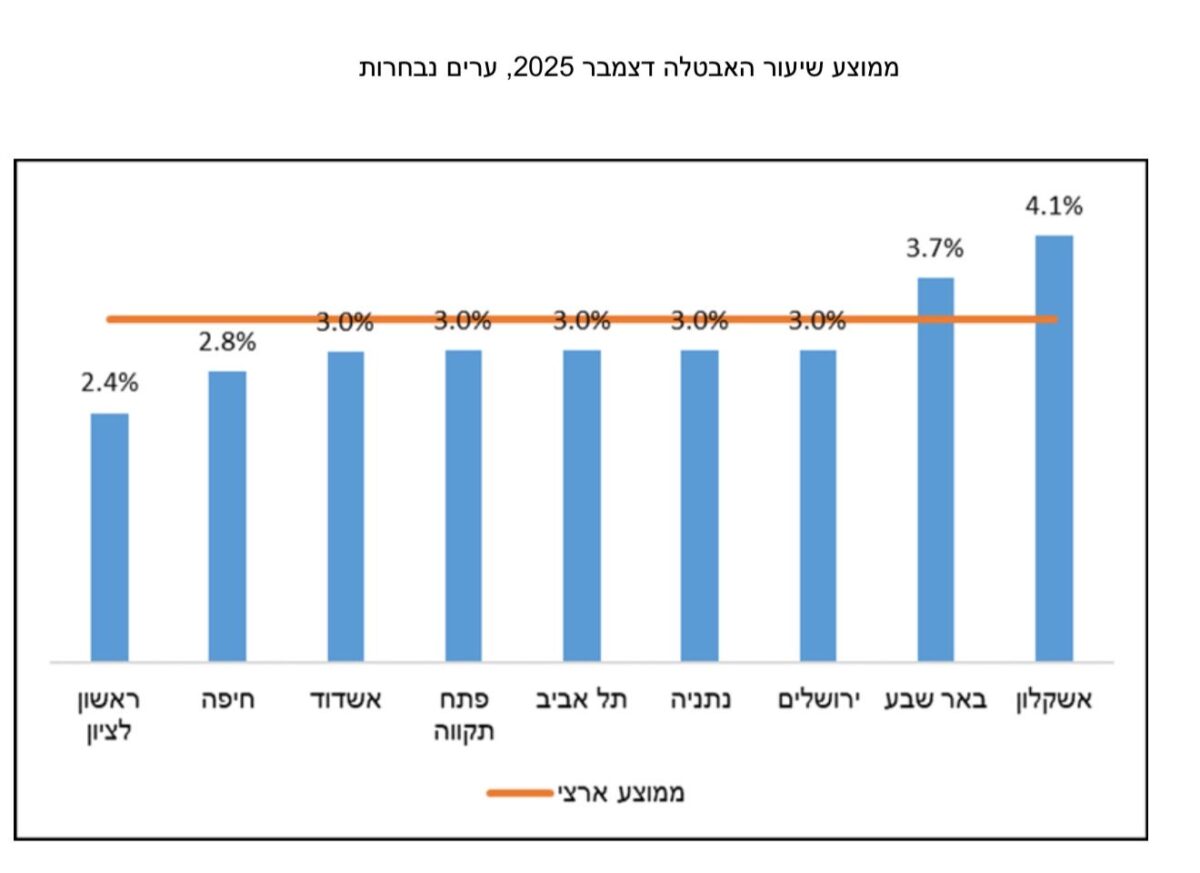 לאחר העלייה בשיעור האבטלה שנרשמה ביוני 2025 בעקבות המלחמה “עם כלביא”, חזר שיעור האבטלה בעיר לרמה של כ 3.0% בדצמבר 2025. מדובר בנתון התואם את הממוצע הארצי, ואף טוב יותר מערים גדולות נוספות בדרום ובמרכז.