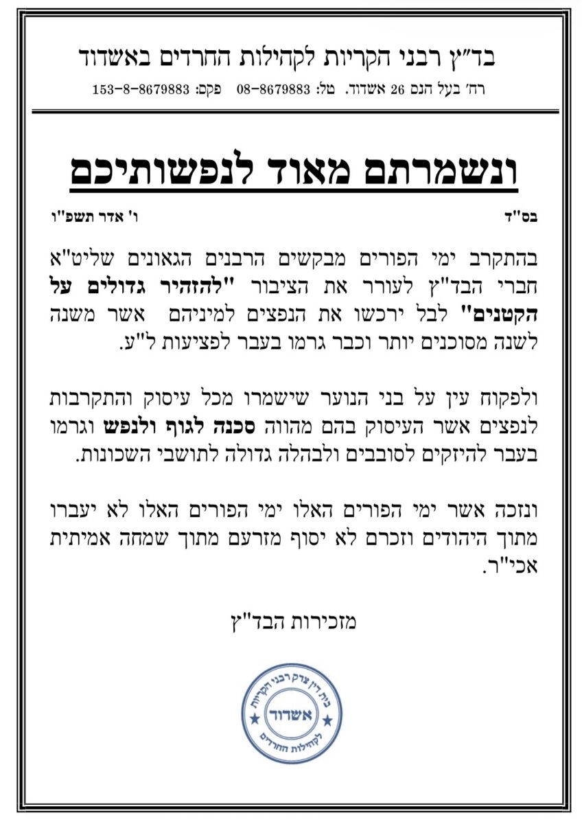 הבוקר (שלישי) יוצאים בבג״ץ רבני הקריות במכתב קריאה לתושבי אשדוד, במכתב מזהירים הרבנים מכל שימוש בנפצים – ״אשר משנה לשנה מסוכנים יותר וכבר גרמו בעבר לפציעות ל״ע״, כותבים הרבנים.