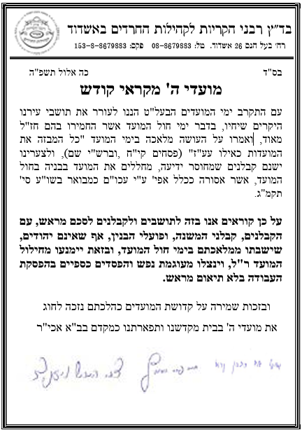 מכתב בד"ץ רבני הקריות על עבודת בימי חול המועד