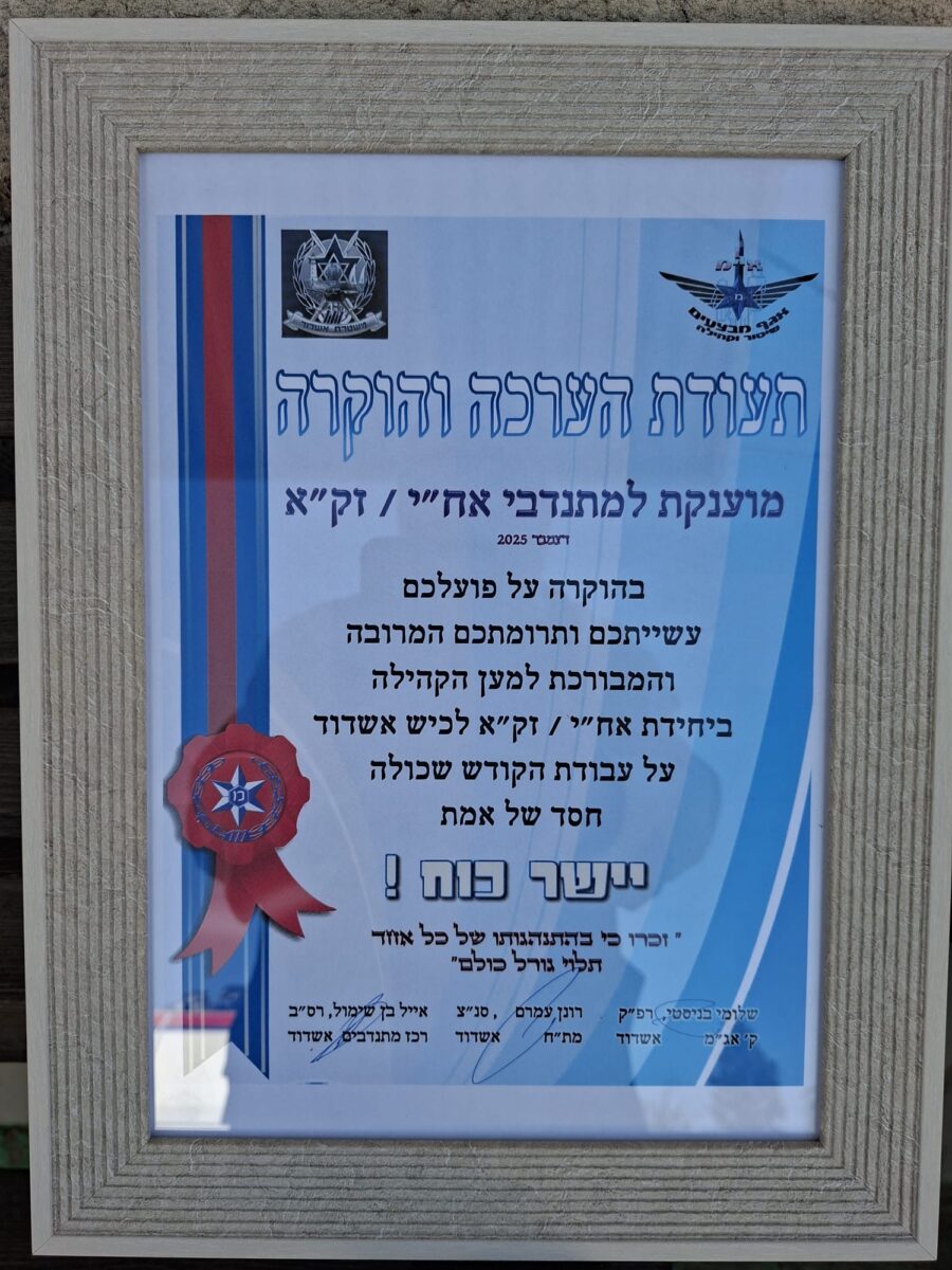 הרב אבי דרעי, מפקד זק"א מרחב לכיש, הוסיף: "התעודה שייכת לכם, המתנדבים האלופים שלנו. אתם הלב הפועם של זק"א במרחב לכיש, ובזכות המסירות, המקצועיות והרוח שלכם אנו ממשיכים לעמוד בחזית העשייה למען כבוד המת והצלת חיים."