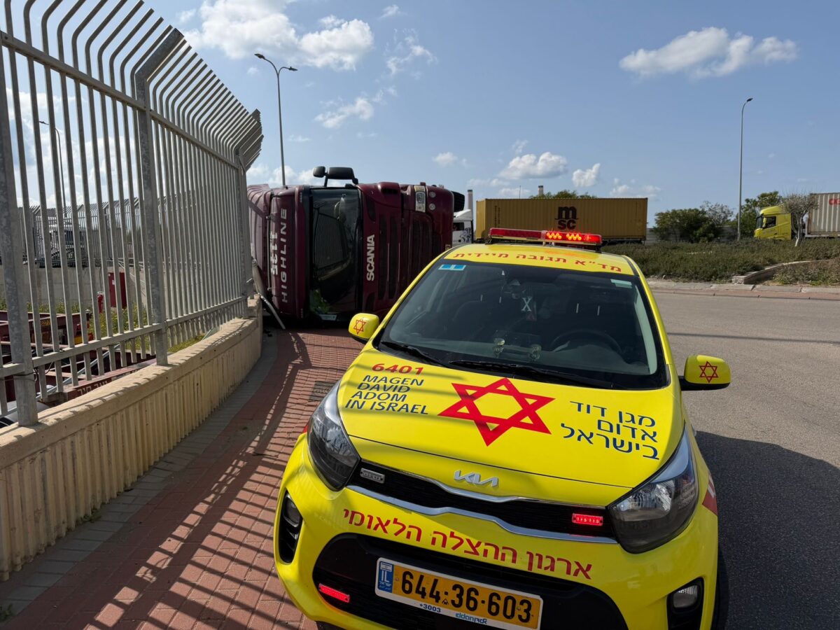 כונני ההצלה הוזעקו לפני זמן קצר לרחוב המכולות באשדוד בעקבות משאית שהתהפכה במקום.