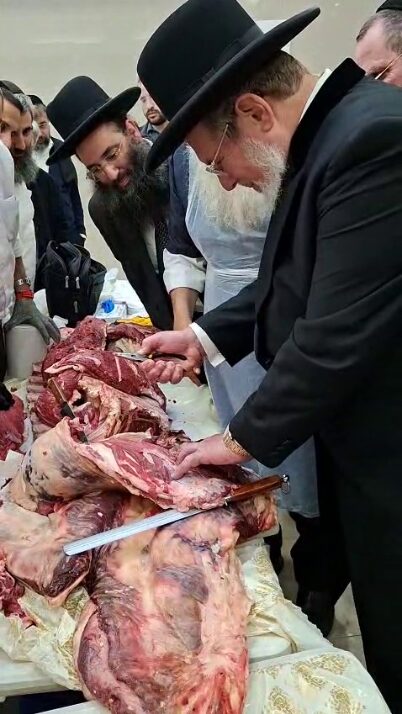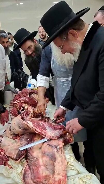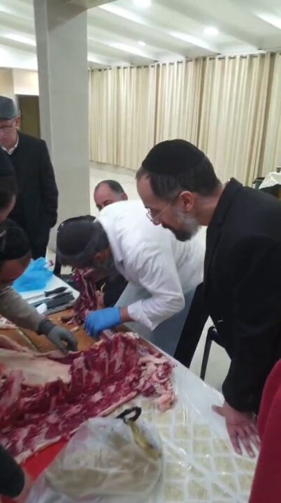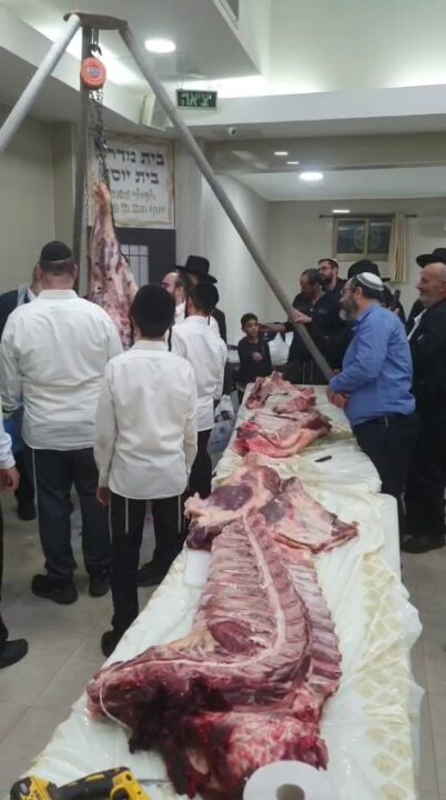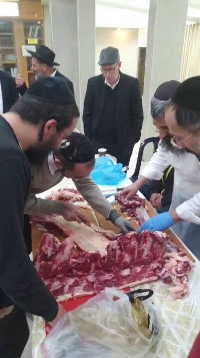 לשם כך אף הובא מנוף קטן, שעליו נתלה חלק אחוריים של הבהמה, אשר בו קיימים חלקים האסורים באכילה מהתורה כמו "חֵלֶב" וגיד הנשה.
