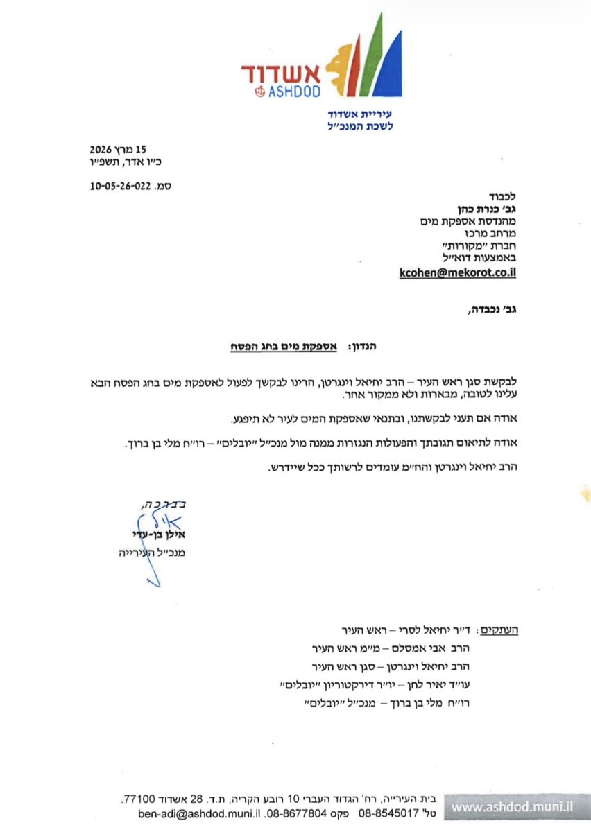 המנכ"ל הוסיף וציין בפנייתו כי יש לפעול באופן שיבטיח כי אספקת המים לעיר לא תיפגע, וכן ביקש לערוך את התיאום הנדרש מול חברת יובלים, סגר"ע יחיאל וינגרטן ולשכת מנכ"ל העירייה.