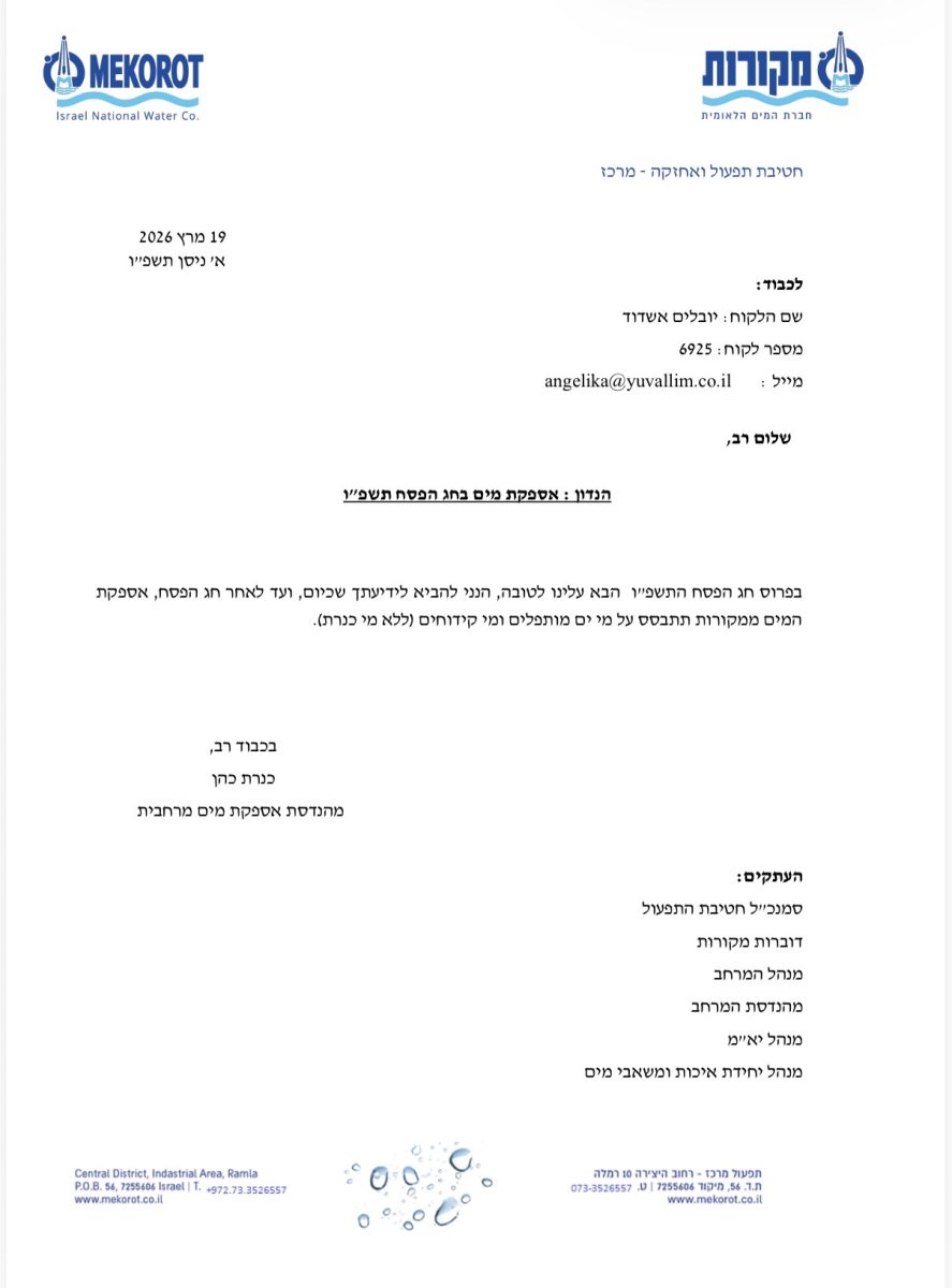מנכ"ל העירייה, אילן בן עדי, פנה כבר בשבוע שעבר לחברת 'מקורות' וביקש להחליף את אספקת המים בפסח לטובת התושבים.