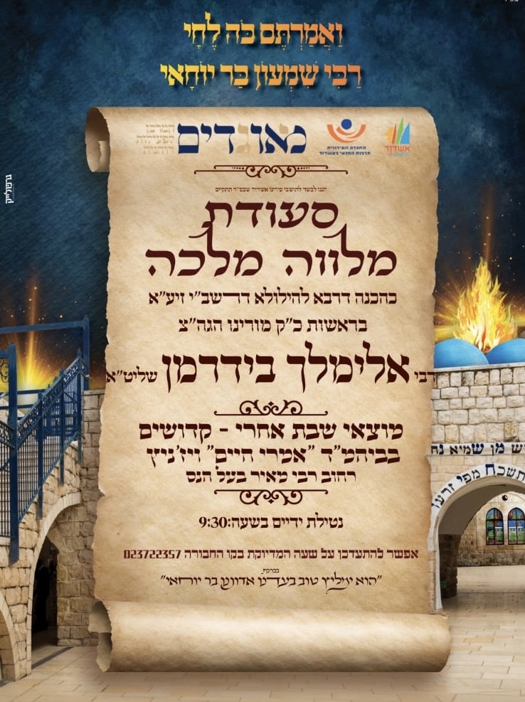 במוצאי שבת הקרוב (אחרי-קדושים), יופיע המשפיע החסידי הרה״צ רבי אלימלך בידרמן שליט״א בעירנו אשדוד ויערוך מלוה מלכה רבתי כהכנה להילולת הרשב״י בל״ג בעומר הבעל'ט בהשתתפות רבים מתושבי העיר.